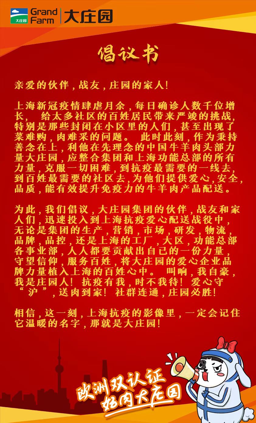 大莊園集團(tuán)火速成立了“大莊園上海抗疫愛(ài)心配送項(xiàng)目組”,并向全集團(tuán)發(fā)出了“共同守“滬” 莊園有我”的倡議書(shū)。